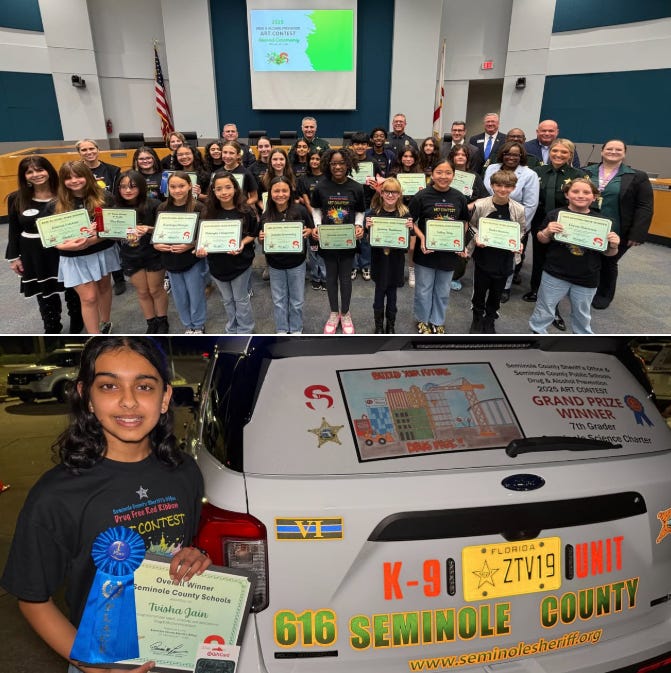 A special congratulations to our grand prize winner — whose artwork is now proudly displayed on the back of our School Resource Deputy’s patrol car, sharing that positive message across Seminole County!