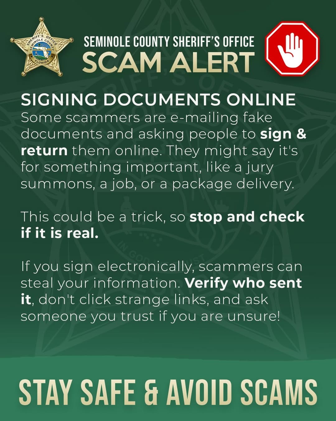We have been made aware of individuals pretending to be members of the Seminole County Sheriff's Office calling residents to tell them that they have missed jury duty or have an active warrant. The numbers have been "spoofed" to make them appear they're coming from a legitimate source. If you receive a call like this HANG UP. The Seminole County Sheriff's Office will NEVER call you requesting digital signatures. You can report these fraudulent phone calls by contacting our non-emergency line at 407-665-6650.